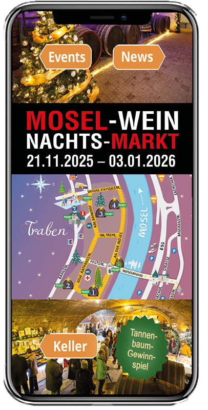 Mit der Mosel-Wein-Nachts-Markt-App erhalten Sie eine detaillierte Übersicht über die Öffnungszeiten, Veranstaltungen, Parkplätze, Shuttle-Busse und aktuelle News des Weihnachtsmarktes in der Traben-Trarbacher Unterwelt.